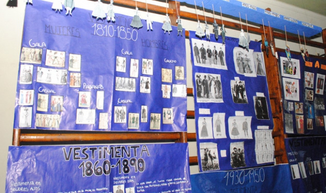 Los estudiantes de 2º y 3º año, mediante láminas, cartulinas y maquetas se encargaron de decorar al Salón Guido Festa con distintos colores y según la temática. Allí se pudo apreciar de un interesante y pintoresco recorrido histórico en materia social, política, cultural e internacional en relación a nuestro país.
